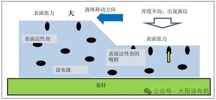 干燥不均或溫度差異導(dǎo)致涂層局部干燥加速,進(jìn)而使該區(qū)域表面活性劑濃度升高并吸附于界面,促使表面張力下降,引發(fā)涂布液向周邊流動(dòng),最終導(dǎo)致該區(qū)域膜厚減薄且分布不均。
