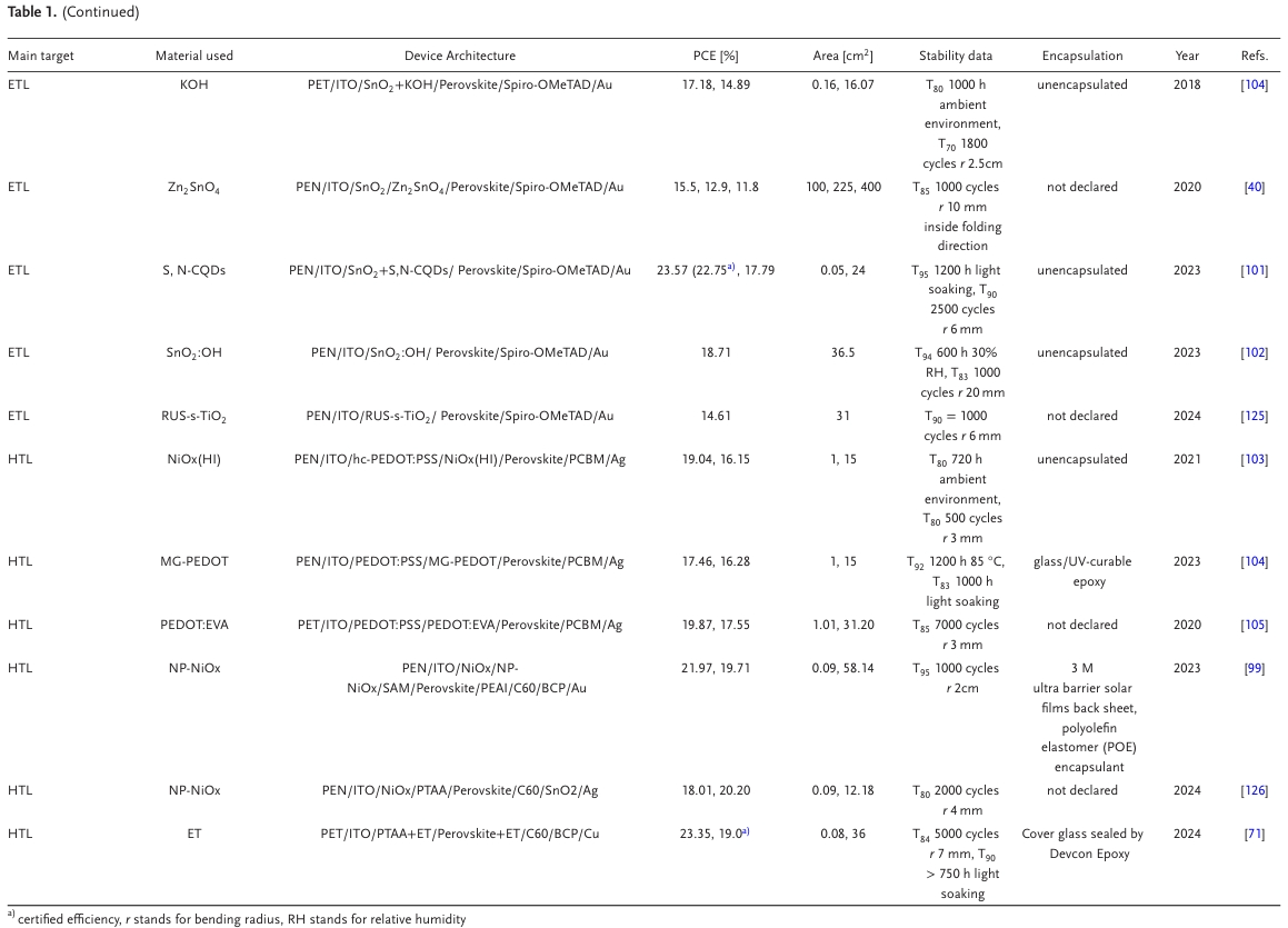 圖2. a) 用于柔性鈣鈦礦太陽(yáng)能技術(shù)的器件結(jié)構(gòu):PIN,NIP和疊層器件結(jié)構(gòu)。b) 重點(diǎn)研究的主要問題是解決限制剛性和柔性襯底之間的差距:柔性襯底的選擇,柔性襯底和TCO之間的接觸,其中ITO的方塊電阻通過襯底彎曲來改變;TCO與HTL ETL之間的接觸,主要問題集中在孔洞的存在以及這些層之間的接觸結(jié)合較差;HTL/ETL與鈣鈦礦之間的接觸(埋底界面),鈣鈦礦層可能會(huì)錯(cuò)位,產(chǎn)生孔洞,并且在HTL / ETL下面的HTL / ETL中具有較差的接觸結(jié)合。