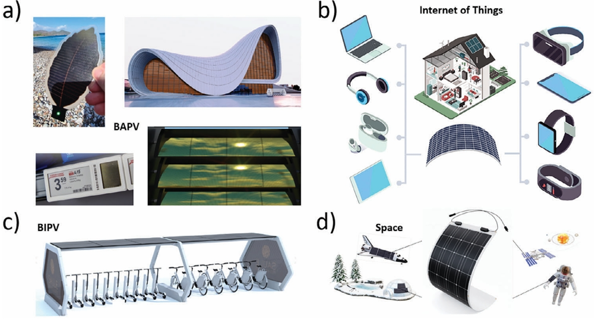圖6. 柔性鈣鈦礦太陽(yáng)能技術(shù)的商業(yè)應(yīng)用:a) 建筑應(yīng)用光伏應(yīng)用(BAPV),具有自由的形態(tài)設(shè)計(jì),可適應(yīng)任何建筑,市場(chǎng)上有2種產(chǎn)品可供使用,如基于鈣鈦礦的電子貨架標(biāo)簽(PESL)和遮光板。源:Saule Technologies b) 物聯(lián)網(wǎng)應(yīng)用,具有潛在的使用基于鈣鈦礦的柔性光伏作為替代品或?yàn)殡姵丶夹g(shù)供電的便攜式設(shè)備存在于住宅和個(gè)人使用中,如智能手機(jī),智能手表和智能帶,便攜式筆記本電腦,無線耳機(jī)和虛擬現(xiàn)實(shí)googles。源:IDTechEx研究;c) 建筑集成光伏(BIPV),通過在建筑中集成柔性太陽(yáng)能產(chǎn)品和特定的裝置,從窗戶和立面收集能量,為電動(dòng)車、代步車和共享單車供電,例如一個(gè)汽車港口站;資料來源:Saule Technologies;d) 適用于空間和極地環(huán)境的柔性太陽(yáng)能技術(shù),因?yàn)槠渚哂凶畹偷墓β手亓勘群洼^好的低溫性能。