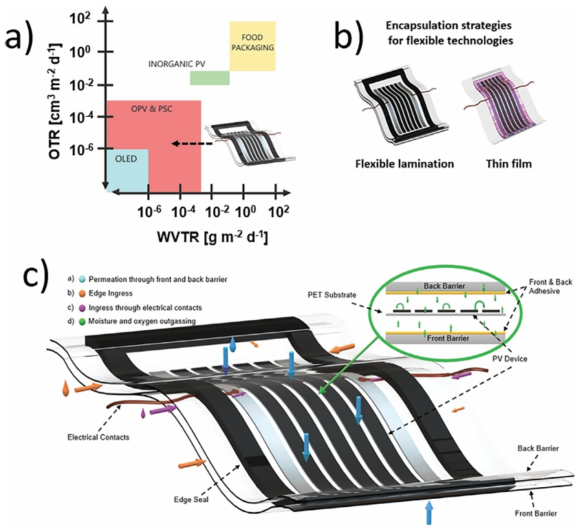 7. 封裝作者認(rèn)為封裝是保證太陽(yáng)能電池壽命、效率和安全性的關(guān)鍵步驟,特別是隨著對(duì)柔性襯底太陽(yáng)能電池的關(guān)注越來越多。柔性模組需要封裝材料在保持柔韌性的同時(shí),對(duì)水分、氧氣和機(jī)械應(yīng)力提供堅(jiān)固的保護(hù)。相比之下,剛性模組使用封裝材料,如乙烯-醋酸乙烯酯(EVA),它提供了優(yōu)異的保護(hù),但缺乏靈活性。對(duì)于柔性模組,薄膜封裝、柔性層壓等先進(jìn)的封裝方法必不可少。柔性鈣鈦礦模塊的封裝通常使用柔性聚合物(例如,聚烯烴、聚氨酯等)和多層阻擋層薄膜等材料。這些材料必須提供低的水蒸氣透過率(WVTR)和氧氣透過率(OTR)來保護(hù)敏感的鈣鈦礦層。例如,聚烯烴等柔性封裝材料可以提供低至0.01 g / m2/day的WVTR值,這對(duì)于保持器件性能和穩(wěn)定性至關(guān)重要。在柔性PSC生產(chǎn)中常見的卷對(duì)卷工藝,需要在很長(zhǎng)的長(zhǎng)度上均勻地沉積封裝層,以實(shí)現(xiàn)一致的保護(hù)。高性能的阻隔膜對(duì)長(zhǎng)期穩(wěn)定性至關(guān)重要,水蒸氣和氧氣透過率(WVTRs和OTRs)是關(guān)鍵指標(biāo)。鈣鈦礦太陽(yáng)能技術(shù)要求WVTR或OTR的阻隔性能反映了這些器件對(duì)水分和氧氣(表5 ,圖5a)的敏感性。實(shí)現(xiàn)如此嚴(yán)苛的阻隔性能對(duì)阻隔薄膜的初始制備和批量生產(chǎn)都提出了挑戰(zhàn)。表5. 封裝材料的特性要求或規(guī)范。