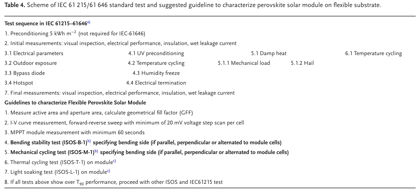 表4. IEC 61 215 / 61 646標(biāo)準(zhǔn)測(cè)試的方案和建議的指南,以表征柔性襯底上的鈣鈦礦太陽(yáng)能組件