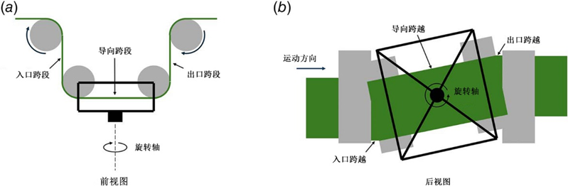 圖3 用于控制卷材橫向位置的位移導向裝置示意圖:(a)前視圖和(b) 底視圖