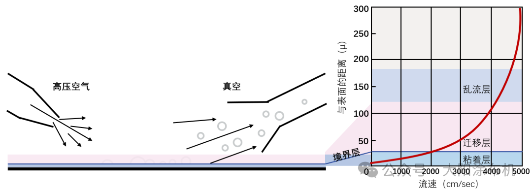 氣刀除塵法通過(guò)噴射高壓空氣剝離基材表面異物,并由真空系統(tǒng)同步回收去除的污染物。但其有效性受限于空氣阻力,氣流在距離薄膜表面數(shù)十微米處顯著衰減,導(dǎo)致邊界層內(nèi)微小異物的剝離力急劇下降(因風(fēng)力減弱無(wú)法將異物卷?yè)P(yáng)至紊流層),故難以清除此類微粒。