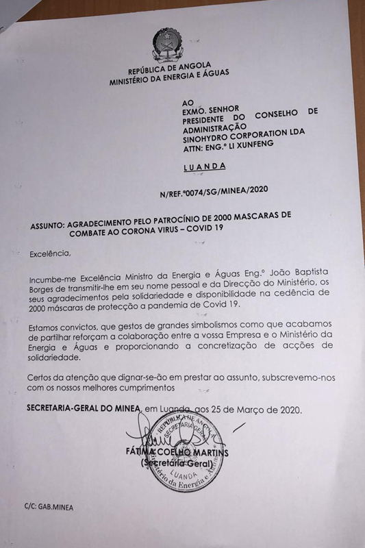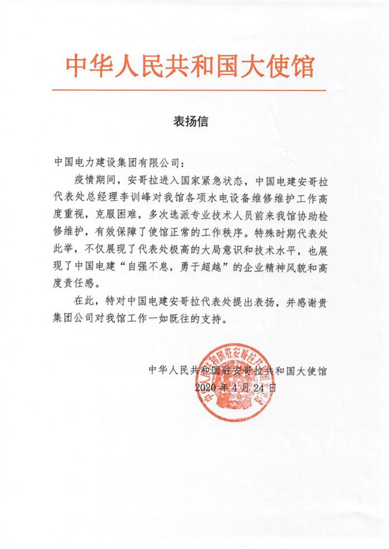 當(dāng)?shù)貢r間4月24日,中國電建安哥拉代表處收到來自中國駐安哥拉大使館的表揚信,信中高度贊揚了中國電建安哥拉代表處在安哥拉進入國家緊急狀態(tài)的疫情期間,克服困難,對使館各項水電設(shè)備維修維護工作高度重視,多次選派專業(yè)技術(shù)人員前往使館協(xié)助檢修維護,為使館在疫情期間的正常秩序提供了有效保障。表揚信對中國電建“自強不息,勇于超越”的企業(yè)精神風(fēng)貌和社會責(zé)任感給予了肯定,并感謝中國電建對使館工作一如既往的支持。